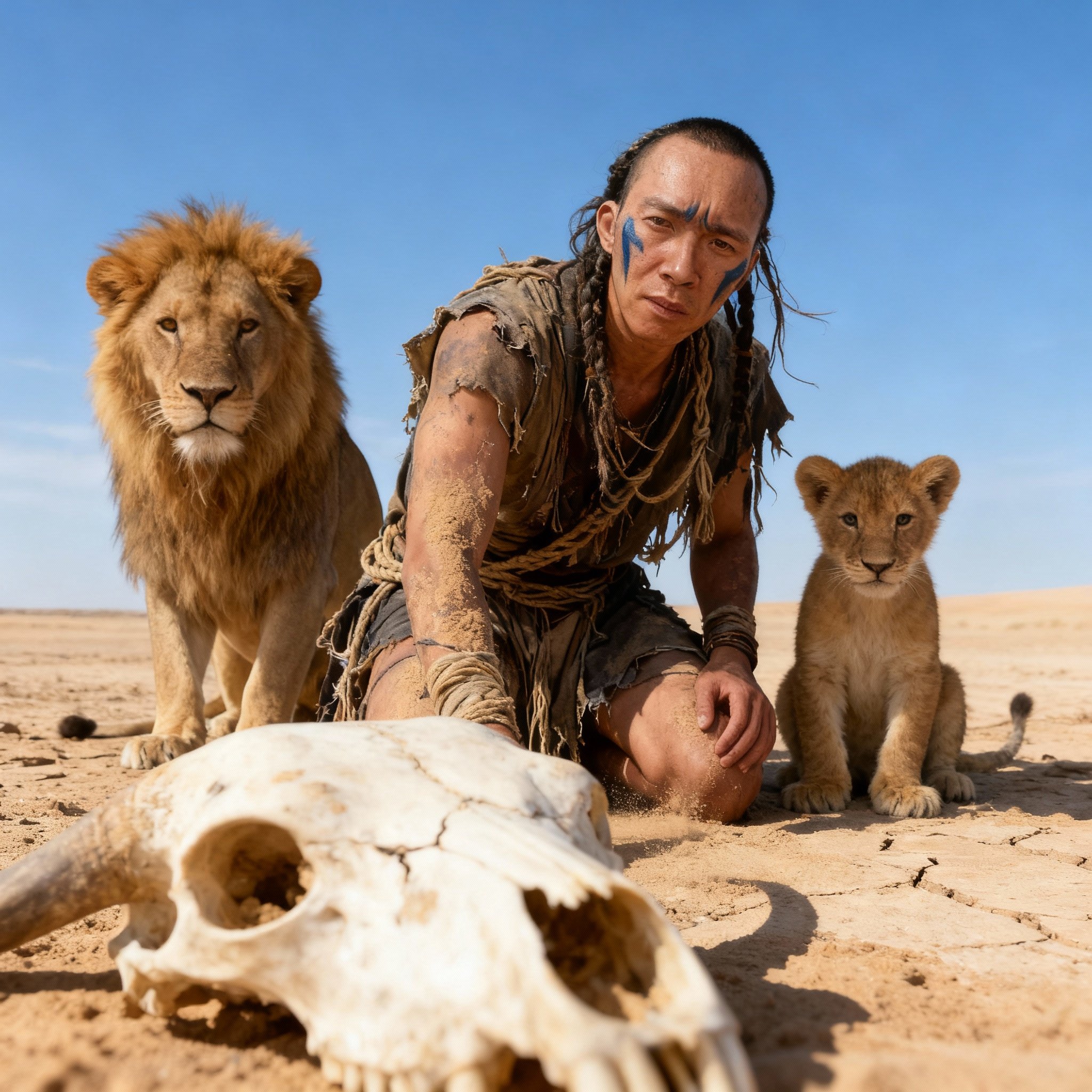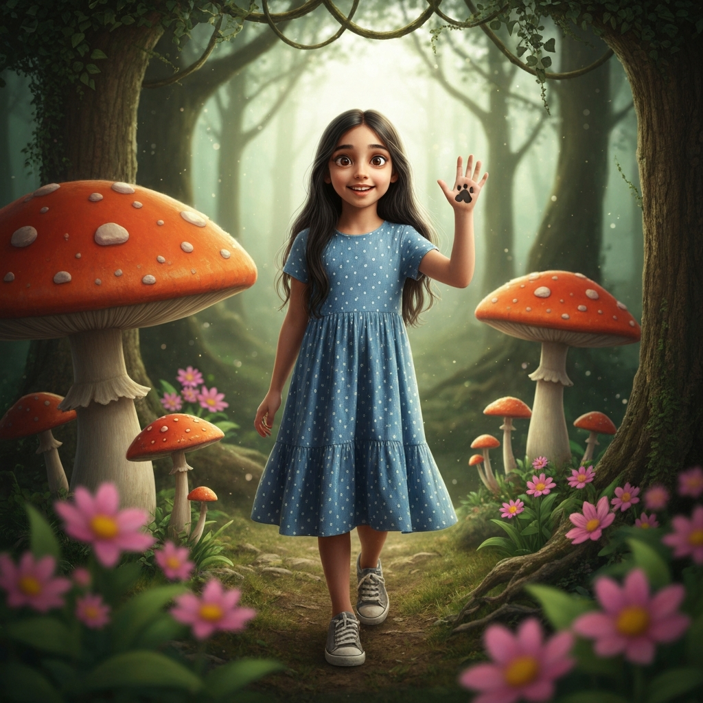 A highly detailed, photorealistic 3D CGI rendering capturing a moment of quiet affection in a remote rural Indian village. The central subject is an elderly Indian grandmother, characterized by a genuinely warm, gentle smile and silver hair tied neatly in a simple bun. She is dressed traditionally in a very simple, unadorned cotton saree. She stands outside…